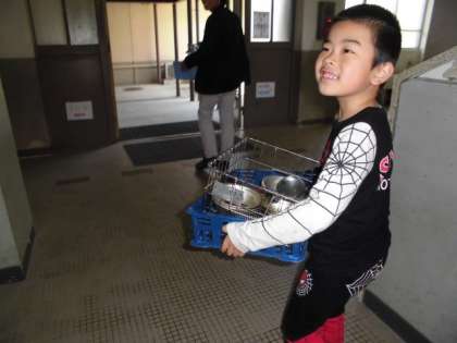 しっかり食べたあとは,給食室に食器の返却ですね。たくさん持って,えらいな。あしたもがんばってくださいね。