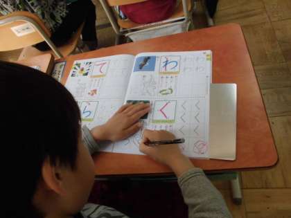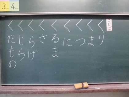 「く」のつくことば,たくさんありますね。はじめは一画のひらがなをていねいに習っています。「く」は「おれ」と「とめ」がありますね。「つ」や「し」には「はらい」がありますよ。むずかしいけど,がんばってれんしゅうしましょう。