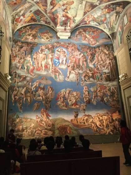 写真はシスティナホールでミケランジェロの偉業を学んでいるところです。