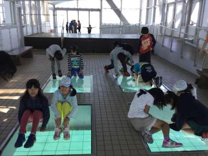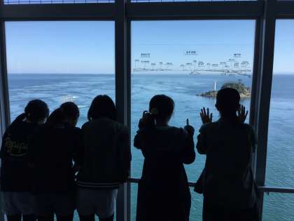 「渦の道」に来ました。「渦の道」は鳴門海峡に架かる大鳴門橋の下に造られた海上遊歩道です。海上45メートルのガラス床からのぞき込む渦潮は、吸い込まれそうでスリル満点!です。