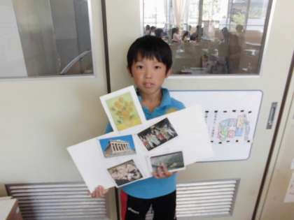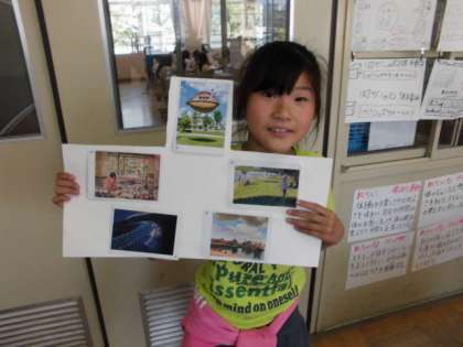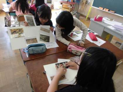 「どこから見ても階段を上っている!」「葉っぱに緑だけでなくオレンジが使ってある!」など,作品の色や形,雰囲気を感じ取りながら一枚一枚を吟味していました。