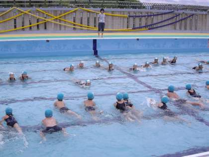 少し寒く子どもたちは「寒い,寒い」と言いながらも,楽しんで水慣れをしていました。