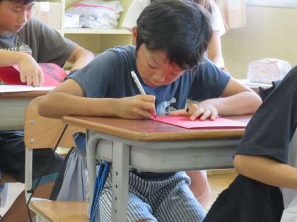 会議室の机にずらっとならんだ活動予定や班のメンバー表,部屋割り表,山の家の地図,すき焼き風煮やカレーの作り方…など,みさきの家のしおりの2倍以上の枚数のあるプリントを順番にとっていき,学年カラーの赤色画用紙の表紙にはさんで完成です。