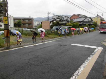 集団登校では,まっすぐ路側帯の中を歩けます。下校時,友達と帰る時にも,路側帯の中を歩くように注意しましょう。