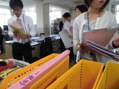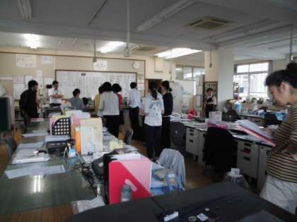 臨時休校になる時には,児童を集団下校させます。あらかじめ,保護者が学校に迎えに来ると登録している児童は,お迎えが来るまで学校に待機させます。その訓練の様子です。放送を聞いて職員室に集まってきた教職員。緊急時用名簿に則って,確実に「集団下校の児童」と「学校に残る待機児童」をわけるのに,緊張が走ります。