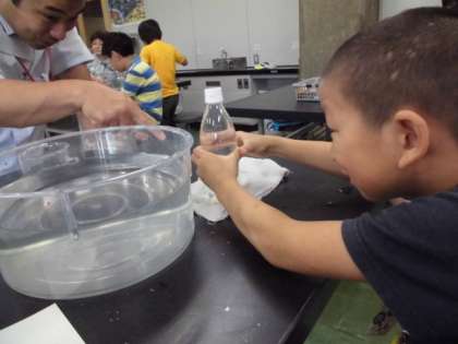 高学年は実験室で「浮沈子(ふちんし)」を作りました。中に入れる容器を浮いたり沈んだりさせるために,何度も重さを調節しました。うまく完成してよかったです。