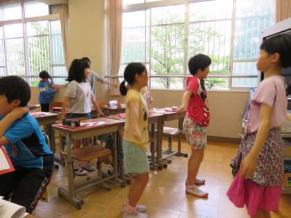 保健係は健康観察カードの作成と,ポスター作成,ラジオ体操の練習に取り組んでいます。