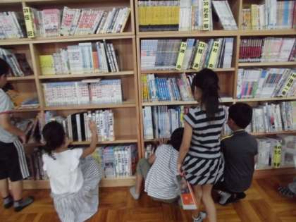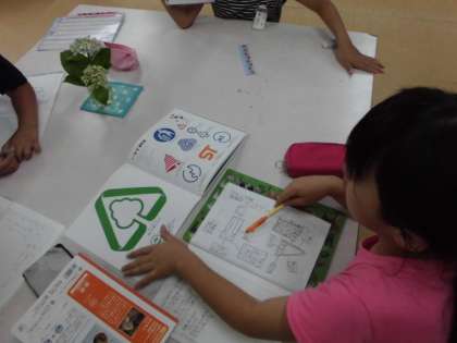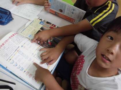 記号を調べています。記号のことが載っている本はどこかな?おうちでも,いろいろなマークをたくさん見つけてくださいね。