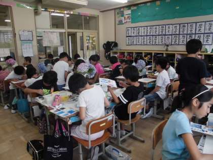 あじさいの形や色をじっくりじっくりみて描く6年生の姿は真剣そのもの。