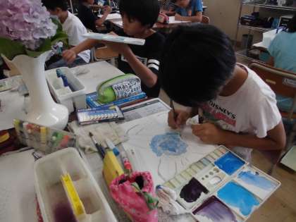 図工の学習では,季節の花「あじさい」を描いています。