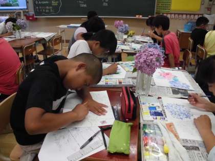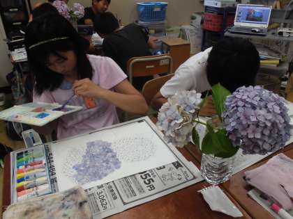 パレットを見ると,同じ紫でも,濃い紫,淡い紫などいろんな色がつくられていました。美しい色使いをしようとがんばっています。