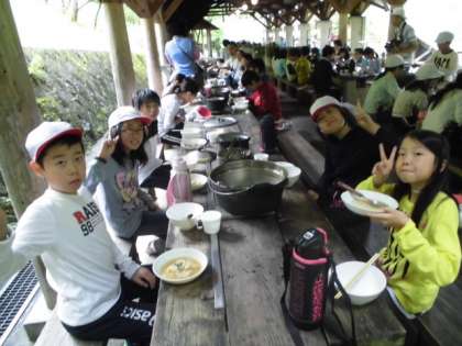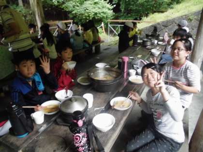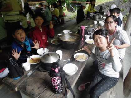 協力して,火からごちそうを作りました。たっぷり食べられました。