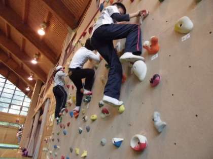 午後は,プレイホールで壁登り(ボルダリング)。高いところが苦手な人も,チャレンジ精神でやってみました。