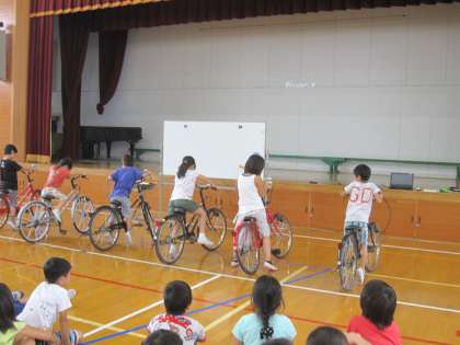 自転車の乗り方のお話を聞いた後,実際に自転車を使ったり,DVDを見たりしました。子どもたちは,真剣にお話を聞いて質問に答えていました。