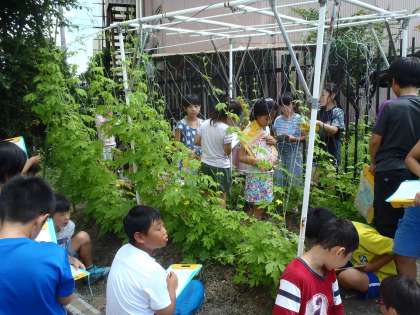 春に自分たちで植えた種がどんどん大きくなって自分たちの身長よりも大きくなりました。よく観察すると,花の下に実ができていることやつるが伸びていろいろな巻きつき方をしていることなどを見つけることができました。