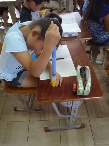理科の学習で筒の中に押し縮められた空気の様子はどのようになっているのかを学習しました。実験を通して,中の空気の様子を図や言葉で表しました。