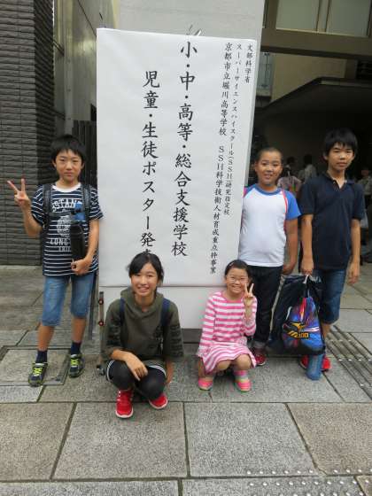 10月8日(土),堀川高校で「小・中・高等・総合支援学校児童・生徒ポスター発表会」が行われ,大枝小学校からは5・6年生5名が参加しました。写真は長時間のポスターセッションが終わり,ほっとした代表5名の記念写真です。