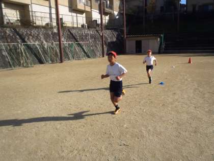 7分間でトラックを走り,1500mを目指しています。子ども達は以前よりもタイムを上げたり,周回を増やしたりするために,呼吸のリズムを考えたりしています。