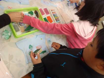 工房学習ではぬいぐるみのTシャツ作りをしました。布を裁ちばさみで切ったり,プロの縫製作業を間近で見せていただけたりして良い時間となりました。また,Tシャツにペンやスタンプ,フェルトなどでそれぞれの作りたいTシャツ作りができました。