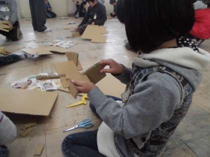 図工では,クミクミックスの学習を行っています。段ボールを切り取って組み合わせた形から想像し,自分の作品を作っていきます。どんなものができるかな??