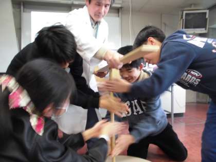 ストップウォッチ片手に,コマが何秒まわるか実験しています。