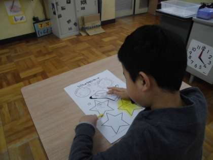 ひまわり学級の担任が変わったので,今日は自己紹介カードを書きました。好きなあそびや好きな食べ物などを紹介カードに書いて掲示をしました。