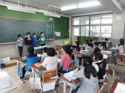 4年生が始まりました!今日の国語は「ばらばら言葉を聞き取ろう」。班で単語を決め,一文字ずつ同時に言って何を言っているのかを当てました。