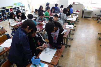算数科では「対称な図形」の学習をしています。きょうはいろいろな図形を,「形に着目して」グループに分けました。「半分に折ったら合同になる!」「回したら同じだ!」など様々な発見がありました。