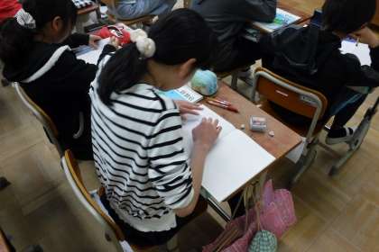 算数科では対称な図形を学習しており,点対称な図形のかき方を考えました。自力解決の場面では,どうすればかけるのかと粘り強く考えながら取り組む姿が多くなってきました。また,グループ交流では,コンパスを使ってかく方法に気づくグループもあり,活発な交流ができるようになっています。