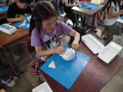 図画工作科で粘土を使って,糸で切って,用具で切り出して,それらを組み合わせて楽しい作品を作りました。作っているうちに何かに似てきたりして,想像をもとに良い作品ができました。とても楽しそうに作品作りができました。