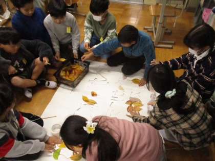 「ゆかいに歩けば」と「スーパーカリフラジリスティックエクスピアリドーシャス」の2曲に合った、カラフルで楽しい感じを落ち葉の色で表現します。