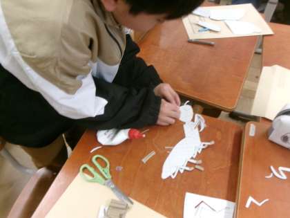今日は版画のはん作りを進めました。生き物の型ができてきたので、いろいろな材料を使ってもようを作りました。