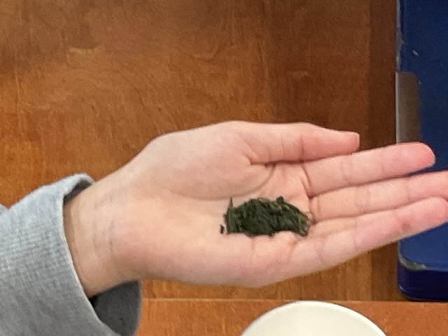 今日は、緑茶の葉を手に乗せて匂いを嗅いでみたり、指先で細かくしてみたりして、茶葉を指や鼻で味わいました。
