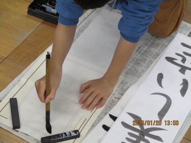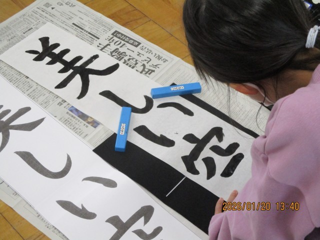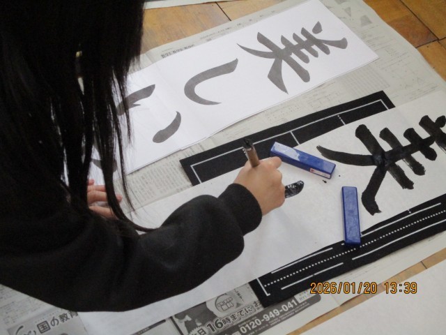 3学期最初の書写の学習は、画仙紙を使って縦長に書きました。
