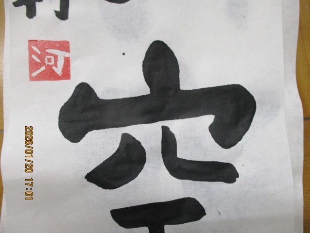 書きあがった作品から一点を選んで名前を書き、名前の角印を丁寧に押して仕上げをしました。