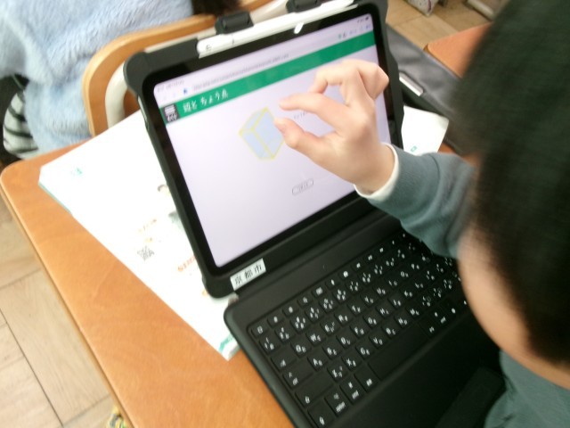今日の算数は、はこの形の辺と頂点の数を調べました。実際につみきを手に持って数えたり、教科書のQRコードを読み取ってタブレット上の図を使って調べたりしました。タブレットでは、図が回転してくれたので、裏側にある辺や頂点が見つけやすそうでした。