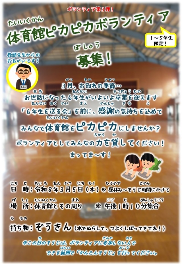 3月2日(月)「体育館ピカピカボランティア」募集!