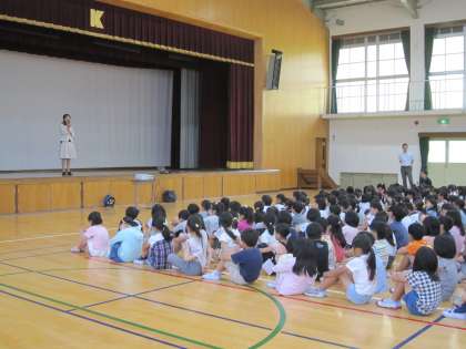 まず学校長から,5月に実施した6年生の「修学旅行」,5年生の「スチューデントシティー学習」,4年生の「みさきの家」での子どもたちの素敵な姿を全校のみんなに伝えました。「修学旅行」ではしっかりと約束を守って行動できたこと,自分たちで考えながら行動していたこと。「みさきの家」では話し手の顔を見ながらしっかりと話を聞いていたことを伝えました。