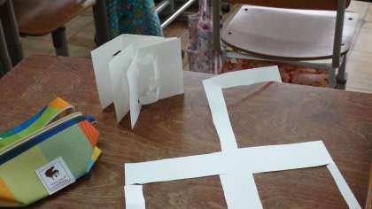 クラフトクラブでは,紙工作にチャレンジしていました。二つに折った紙に切込みを入れることで,開くと飛び出てくる手紙をつくっていました。