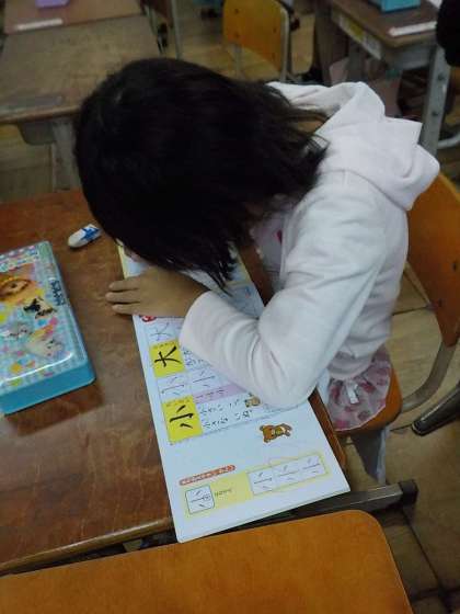 1年生では,スキルタイムにドリルを使って,ひらがなの復習をしています。