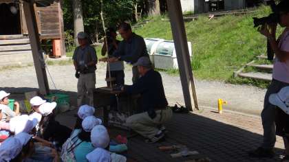 野外炊事のために、みんなで火おこしをしています。グループで協力して一生懸命がんばっています。すべての班が火を着けられることを目指します。