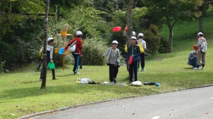 朝食を食べた後は,グループにわかれてフライングディスクゴルフを行いました。スタートからできるだけ少ない回数でゴールに入れられるように競い合いながら楽しみました。