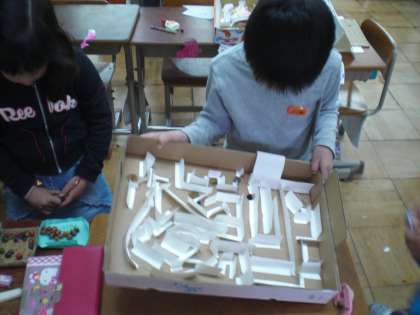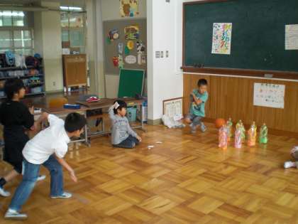 店をまわっていると,ボーリング一つにしてもペットボトルをカラフルに飾ってあり,それぞれに工夫を凝らしていました。「魚つり」「くじ引きや」「けん玉(まつぼっくりを利用)」「わなげ」「どんぐり迷路」などなど・・・。