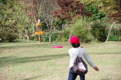 スタート位置から、できるだけ少ない回数でゴールに入れようと、子どもたちは考えて投げます。「学校のディスクとちがってちょっと曲がりやすいな。」などグループで楽しんでいるようです。秋空の下、子どもたちは元気に活動しています。
