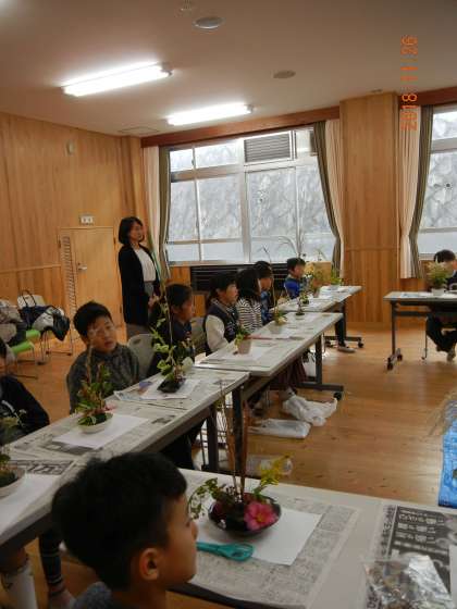 この日,4年生は総合的な学習の時間に生け花体験を行いました。コミュニティーティーチャーの方々にお世話になり実施することができました。校内の植物を使って,今の季節を小さな器の中に表現しました。28日の創立30周年記念式典・学習発表会でも展示します。ぜひご覧ください。
