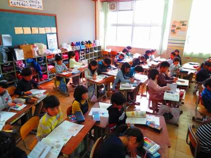 国語科の学習で「冬がいっぱい」を学習しました。教科書に載っている「ゆき」という歌を紹介すると,「あっ,聞いたことある!」と口ぐちに言っていました。みんなで一緒に歌った後,「どんなときに冬だなあ」と感じるのかを考え,カードに書きました。「みかんを食べたときに冬だと感じる。」「気温が下がって寒くなってきたら冬だと感じる。」と自分の考えをカードに記していました。