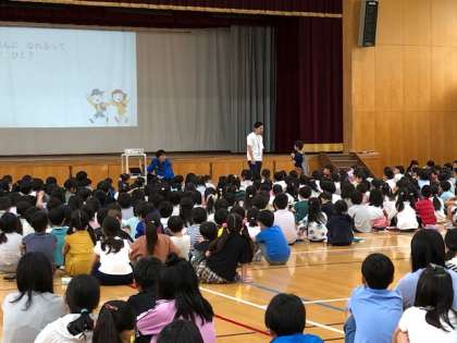 1時間目に全校児童が体育館に集まり,1回目の児童集会を行いました。はじめに3年生以上の学級代表委員が自己紹介をしました。どんなクラスにしたいか,どんなことをがんばりたいかという自分の思いをしっかりと伝えていました。下のフロアで聞いていた子どもたちも,自分のクラスの学級代表が話すのを温かく見守っていました。そして,各委員会の委員長があいさつをしました。