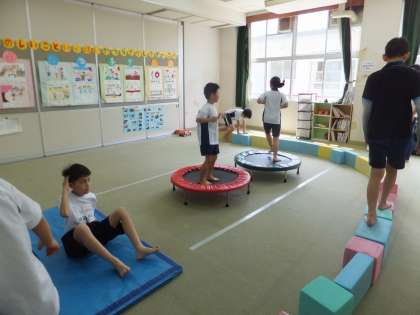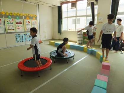 今,やまゆり学級では,体育の学習で,「いろんな運動を楽しもう」という活動をしています。ストレッチとランニングをした後に,マット,トランポリンをしたり,ブロックで作った平均台のようなものを歩いたりしています。みんなの好きな音楽に合わせて活動することで楽しみながら活動ができています。