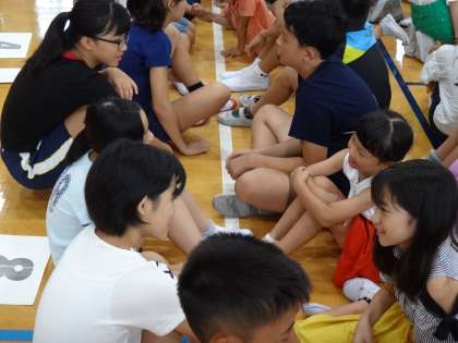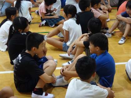 今日の児童集会では,たてわりのグループに分かれて,ほっとタイムを行いました。ほっとタイムは,今年度から始めた構成的グループエンカウンターの取組です。人と人とのつながりを広げ,深めることを目的に進めています。子どもたちには「ほっと ひといき ついて みんなで たのしむ じかんです。」と紹介しています。今日は,たてわりグループで二人組をつくり,好きなことや好きなものなど,フリートークを楽しみました。