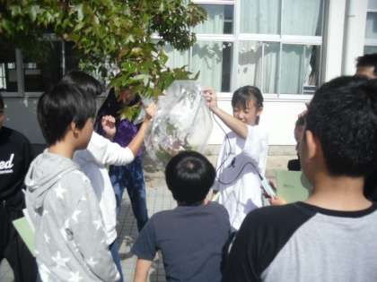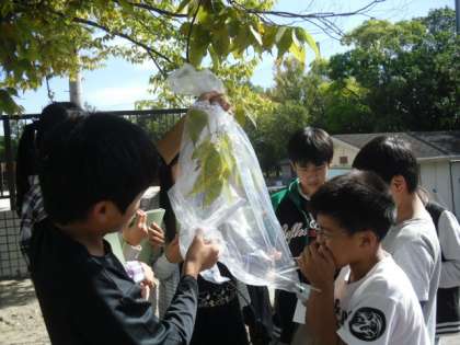 「植物は本当に空気の中の二酸化炭素を取り入れ,酸素をだしているのか」ということを学習のめあてにして実験を行いました。植物に袋をかぶせ,吐き出した息を入れて酸素や二酸化炭素の量がどうなるかを調べました。
